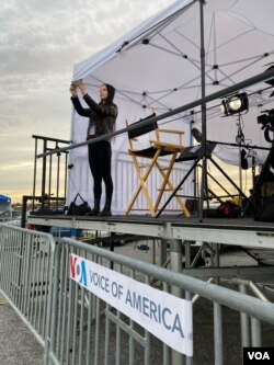 美国之音中文部记者鲍蓉大选日在民主党总统候选人拜登家乡特拉华州威尔明顿采访和报道。(2020年11月3日)