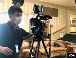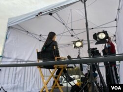 洛杉矶圣安尼塔公园投票站,美国之音摄影师Roy Kim正在调试机器,为即将进行的中文部连线做准备。(雨舟2020年11月3日拍摄)