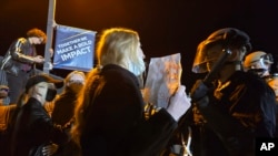 在北亚利桑那大学,一名支持巴勒斯坦人的抗议者举着标语与警察对峙。(2024年4月30日)