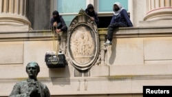 在哥伦比亚大学,一名学生抗议者从汉密尔顿楼的一座阳台把装着食物的框子吊上来。(2024年4月30日)
