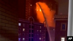 视频截图显示,乌鲁木齐消防人员向发生大火的住宅楼喷水灭火。